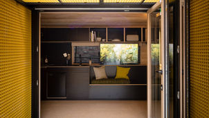The RACV Tiny Home, designed by Maddison Architects in 2018, is a transportable dwelling intended to serve as a showcase for sustainable and affordable living. Commissioned by the Royal Automobile Club of Victoria (RACV) and designed by Peter Maddison, the host of Grand Designs Australia, the tiny house toured Victoria to educate the public on green building practices. The home was awarded a Commendation for Sustainable Architecture at the AIA Victorian Architecture Awards in 2019. The design is a contemporary reinterpretation of the traditional gabled house, which was chosen as an iconic shape of home. To maximize space and create a dynamic, welcoming entrance, the home features bright yellow, hydraulically-operated panels that fold out to form a deck and sunshades, reminiscent of a box unfolding. The 18.75-square-meter structure is built on a durable steel frame, allowing it to be transported on the back of a truck, and can function entirely off-grid or connect to services. Sustainability is a core component of the RACV Tiny Home. It was constructed with a seven-layered wall and roof system that includes "phase change" insulation, making it 60% more energy-efficient than a standard Australian home. It also incorporates passive design principles and active systems like integrated solar panels and battery storage. Locally sourced materials were prioritized to reduce carbon miles, including charred timber boards for the exterior and radial sawn Victorian hardwood and cork flooring for the interior. The design also features smart technology, allowing for voice-activated control of various functions, from lighting and entertainment to security and energy monitoring. The interior space is cleverly organized with a main living area that combines the kitchen, sleeping, and living spaces, along with a separate bathroom. The design includes built-in furniture to maximize efficiency, such as a built-in bed and bench, a slide-out dining table, and a cargo net that serves as a playful loft for children. Credits Architects: Maddison Architects Client: Royal Automobile Club of Victoria (RACV) Textile Consultant: Clare Kelder Builder: Simple Motion Engineering: WGA Manufacturers: Paarhammer Windows and Doors, Danaplon, Eco Timber, Envirowalk, Lysaght, Phase Change, Premium Floors Australia Photography: Andrew G. Hobbs