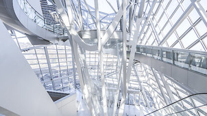 Mutations of form, penetrations, deformations, simultaneities, breakdowns, and variabilities affect architecture. The resulting architecture is characterized by the interactions, fusion, and mutation of different entities constituting a new shape. The building ground of the museum is located on a peninsula that was artificially extended 100 years ago. Even though it was apparent that this site would be a difficult one (536 piles had to be securely driven 30 meters into the ground), it was clear that this location would be very important for urban design. The building should serve as a distinctive beacon and entrance for the visitors approaching from the South, as well as a starting point for urban development. The striking interface situation of the construction site at the eponymous confluence of the Rhône and the Saône inspired the superposition in the urban space of two complexly linked architectural units, crystal, and cloud. The cloud structure, floating on pillars, contains a spatial sequence of black boxes— admitting no daylight, to achieve maximum flexibility for exhibition design. The Musée des Confluences does not consider itself as an exclusive “Temple of the Muses” for the intellectual bourgeoisie but as a public place providing access to the knowledge of our age. To build a museum of knowledge, a complex new form had to be developed as an iconic gateway. A building that truly stands out can only come into being through shapes resulting from new geometries. It was important to the concept that the flow of visitors arriving from the city to the Pointe du Confluent should not be impeded by a building. The idea was therefore to develop an openly traversable building that would be floating in part only on supports, to create a public space underneath. The architecture hybridizes the typology of a museum with the typology of urban leisure space. The concept of two complexly connected architectural units is a result of the striking interface-like situation of the building site. The crystal rising towards the side of the town is conceived as an urban forum and entrance hall for visitors. Its shape that can be read clearly stands for the everyday world. In contrast to this, the cloud hides the knowledge about the future; it is a soft space of hidden streams and countless transitions. Within the Musée des Confluences the present and the future, the known and the still unknown are conceived as a spatial arrangement trying to “spur public curiosity”. As an extension of the park located on the Southern tip of the island a new urban space formulates itself; a landscape consisting of ramps and surfaces merging the inside and the outside and resulting in a dynamic sequence of spatial events. This movement is also followed by the alternating spatial structure of the exhibition halls. Closed black boxes and free exhibition areas alternate by exploiting the double room height of two levels. Essentially, the building consists of three parts. Situated on a slightly raised base (due to the high groundwater) that houses the production workshops, the auditoriums, and the group visit reception area, crystal — foyer, and cloud – exhibition area. Environmental concept The foyer (crystal) is a naturally ventilated space. The supply air enters via glazed ventilation flaps inside the east facade while the exhaust air exits via the roof area. It is, therefore, unnecessary to use a traditional air conditioning system. Only the main access areas and workspaces are microclimatic units whose comfort is ensured through local heating and cooling systems. The floors are cooled via groundwater. This will result in significant energy savings for the museum’s foyer in the long term. In terms of thermal insulation, the facades of the exhibition area (cloud) are characterized by an extremely efficient building shell. All of the main access areas are illuminated naturally (not much artificial light); the water supply of the sanitation areas is provided through the groundwater. A photovoltaic system is installed on the roof.