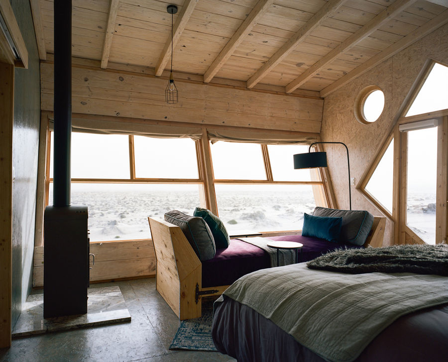 "Perched on the sand dunes of Namibia's remote Skeleton Coast, the Shipwreck Lodge, designed by Nina Maritz Architects, is a unique retreat that draws its inspiration from the area's maritime history. The lodge is located in the Skeleton Coast National Park, an unforgiving landscape marked by the remains of vessels that have been wrecked by the treacherous Atlantic waters. The lodge's angular, timber cabins are designed to evoke broken fragments of these lost ships, creating a sense of desolation and remoteness while offering a comfortable and highly sustainable guest experience. The cabins are part of a larger concession that includes staff accommodation and back-of-house facilities housed in repurposed shipping containers. Each of the ten guest cabins is constructed from pre-manufactured panels in Namibia's capital, Windhoek, and assembled on-site to minimize environmental disturbance. The timber-framed structures are designed to resist the harsh coastal conditions and are nailed with an innovative timber nailing system to minimize the use of rust-prone metal. The entire lodge can also be dismantled and removed without leaving a trace at the end of its 25-year concession. The two-part design of each cabin features a bedroom with a pitched roof and a large window offering panoramic views, which is connected to a pointed, ""bow-like"" bathroom structure. Interiors, designed by Melanie van der Merwe of Women Unleashed, feature a cozy wood-burning stove and a material palette that includes recycled plastic bottle insulation, reclaimed timbers, and organic textiles. A central lodge, echoing the aesthetic of the cabins, houses the restaurant and lounge, providing a communal space with large windows and an outdoor deck to take in the dramatic views. The lodge is entirely solar-powered, with electrical systems designed for maximum efficiency using timer and motion-sensor switches. Water is sourced from a borehole and conserved with efficiency measures, and sewage is treated on-site. The lodge's low-impact design, use of sustainable materials, and commitment to conservation led to it being named ""Best Safari Lodge"" by Jetsetter in 2019. Project credits Architecture: Nina Maritz Architects Interior Design: Melanie van der Merwe, Women Unleashed Builder: Pepe Bush Camp Builders / Pepe Construction CC Suppliers (Timber): On The Deck Photography: Michael Turek, Shawn Van Eeden, Denzel Bezuidenhout"