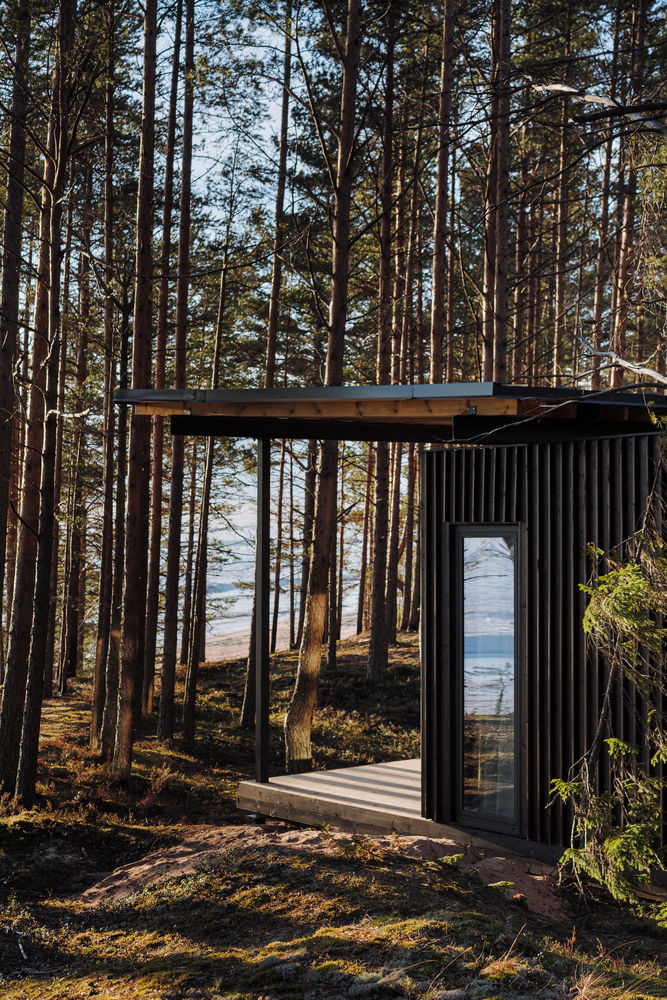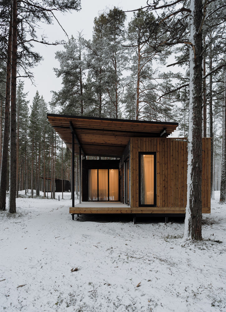 "The Tochka na Karte (meaning ""A Point on the Map"") Country Hotel is a modern hospitality complex located on the wild, isolated eastern shore of Lake Ladoga in the Republic of Karelia, Russia. Designed by the Russian architectural firm Rhizome, the project is surrounded by a pine forest and a vast sand beach, which provided the primary inspiration for its design. The hotel's architecture is a sensitive response to this natural context, focusing on minimal intervention and a deep connection between the buildings and the landscape. Constructed using sustainable prefabricated technology, the hotel was assembled from modules at a factory and then transported to the site. This approach was chosen for its suitability and minimal environmental impact in such a remote location. The complex is comprised of 15 individual L-shaped cabins, a reception building, and other guest facilities, all designed to be ""dispersed"" among the pine trees. Each cabin consists of two modules that include a compact space for up to four guests and a large terrace. Inspired by the tradition of Nordic saunas, the cabins are also equipped with private saunas. The design emphasizes the interaction between the guests and the environment. All rooms feature floor-to-ceiling glazing, ensuring every guest can enjoy panoramic views of the lake and forest. The exterior is clad in wood and dark metal, a color palette that allows the buildings to subtly recede into the landscape, highlighting nature as the main focal point. Inside, the use of natural wood continues, creating a cozy and rustic atmosphere. The hotel is a successful example of harmonizing modern architecture with a pristine, natural setting, providing guests with a tranquil, contemplative retreat. Credits Architects: Rhizome Lead Architects: Evgeny Reshetov, Tatiana Sinelnikova Design Team: Yana Demina, Ilya Belyakov Photography: Dmitry Tsyrencshikov Location: Vidlitsa, Republic of Karelia, Russia"