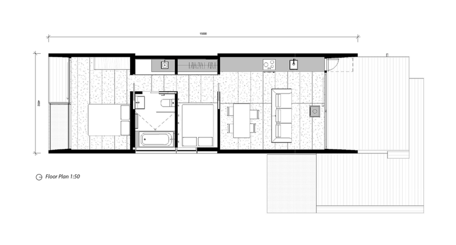 Dimensions: The cabin has a modest footprint, measuring 12 by 5 meters, with an additional 50 square meters of decking.