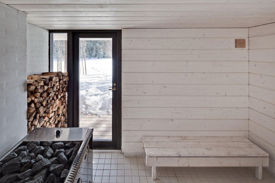 The main villa and a separate, 24 m² sauna building were built with a modest budget, aided by the ascetic, off-grid nature of the facilities.