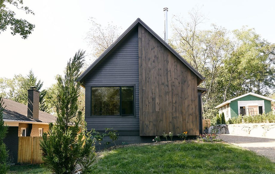 We designed this modern home to fit the scale of the neighborhood, which was mostly one-story bungalows. The house is conceived of as two small cabins. The front cabin is a one-story structure that faces the street and keeps with the scale of the block. It houses the living room, kitchen, and dining room, while a small bump-out at the front allows for a wood burning stove and built-in media cabinet. The back cabin is a two-story structure that contains the bedrooms, bathrooms, a small office and laundry. The upper level of the back cabin houses the primary bedroom with views over the Biltmore Estate grounds. Between the two cabins is the entrance. With dark wood walls and a small built-in bench under a circular window there is an undeniable tea-house vibe as you enter the home. When designing the home, we went for a “warm” modernism. We love the clean lines and thoughtful composition of modernism, but did not want the house to feel cold or sterile. As such, we included a number of custom built-ins and plenty of naturally finished wood walls and ceilings. The kitchen has white oak cabinets with birch walls and oak floor. The primary bathroom has an arched shower, birch ceiling, and skylights. The end result is both modern and inviting. We were also really lucky to have an amazing client in Everyday Oil owner Emma Allen. We worked with her to select handmade tiles for the bathrooms and kitchen backsplash and she did an amazing job of sourcing all the interior furniture and bed sets.