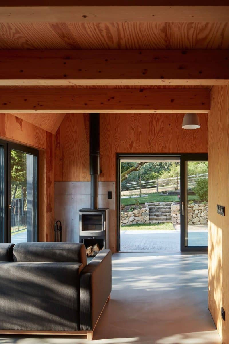 Skylight Hut is a renovated countryside retreat located in a recreational area in the Sázava River region, near Prague in the Czech Republic. Designed by Atelier Hajný and completed in 2024, the project transformed a derelict, 1970s single-story hut into a contemporary and airy two-story home. The clients, a couple from Prague, wanted a tranquil escape for weekends and remote work, but faced challenges from strict local zoning regulations. Atelier Hajný's design solution addressed the need for more space while adhering to a maximum height limit of 7.7 meters. The most distinctive feature is the truncated, asymmetrical hip roof, topped with a pair of skylights. This design minimized the building's overall height and prevented it from blocking the views of neighboring properties. The architects kept the original 1970s stone base, stripping the building to its foundation. A new, modern metal structure was then built upon this base, supported by a concrete slab and concealed pillars. The trapezoidal metal sheeting that clads the roof and façade gives the home a modern look while offering durability and minimal upkeep. The dark color helps the structure blend with the natural surroundings. The skylights not only provide natural light but also enable chimney ventilation, which, combined with a significant roof overhang, helps regulate the indoor climate throughout the year. Inside the 46-square-meter cabin, the design maximizes space and light to create a cozy and warm atmosphere. The interior is defined by an extensive use of light pine plywood with a prominent grain, which covers the walls, ceilings, and custom furniture. This contrasts with the dark, minimalist exterior, creating a brighter indoor environment. he ground floor features an open-plan layout connecting the living, dining, and kitchen areas. Large windows on the south and east sides provide dynamic views and flood the space with natural light. An attic bedroom is nestled under the asymmetrical roof, illuminated by the innovative skylight system. A small fireplace adds extra warmth and coziness to the main living area. The bathroom has a simple and modern aesthetic, with a gray plaster finish. Project credits Architecture: Atelier Hajný Lead Architect: Martin Hajný Location: Sázava River Area, Czech Republic Completion Year: 2024 Photography: Radek Úlehla Manufacturers: Lindab, Velux