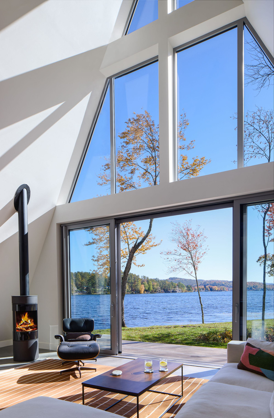 A-Frame is a single-family private residence located on Lake Bomoseen in Vermont. The project site is on the western shore of the lake and adjacent to the vehicular bridge. The structure is designed for maximum views and ground access to the lake front. The main gable structure accentuates the eastern lake views with floor to ceiling glass and is bookended with an open deck that leads to the lake and boat dock. The secondary gable form provides views to the south from the first floor and upper roof deck.