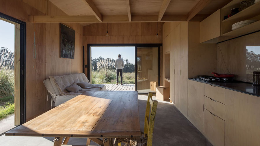 "Chajá House is a refuge in the Maldonado department of Uruguay, designed by the TATÚ Arquitectura studio and completed in 2020. The project transformed an old, abandoned agricultural shed, formerly used to store fodder and tools, into a secondary residence for a client who lives in France. The intervention was conceived to preserve the rural identity and the original structure of the building, without modifying its main volume. The architecture is characterized by its focus on reuse and integration with the natural environment. The design consisted of wrapping the existing masonry structure with a new, permeable wooden skin. This outer membrane not only conceals the new functional programs but also creates interstitial spaces that expand the use of the home. The project seeks to pay homage to the humble typology of the Uruguayan countryside while transforming it into a poetic architectural gesture. The interior is a diaphanous volume with an open plan, defined by a furniture wall that integrates the kitchen, pantry, and a desk. Above the dining area, a loft houses the bed and wardrobes. The bathroom and service areas remain in an external volume, honoring the rural traditions of Uruguay. Large windows capture views of the landscape, while subtle natural light enters through narrow slits in the wooden membrane, accentuating texture and depth. Credits Architects: Leandro Alegre, Horacio Goday, and Martin Olivera of TATÚ Arquitectura Design Team: Agustina Rodríguez, Lucía Arce, and Lucas Cardona Photography: Marcos Guiponi"