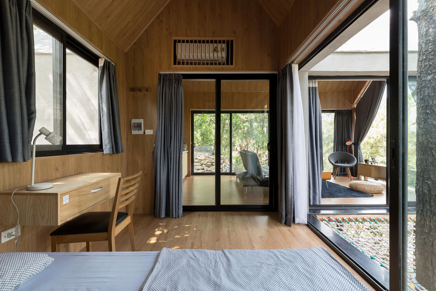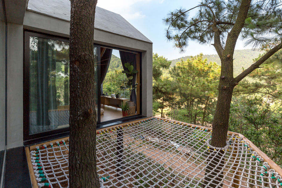 Forest House 02 is a minimalist and lightweight tiny home designed by Chu Van Dong of D12 Architect. Completed in 2018, the 45 m² house is located in the northern mountains of Vietnam, near Hanoi, and was created to serve as a serene retreat for 2–4 people. The house is notable for its innovative, treehouse-inspired design, which perches it on a steep hill and uses a playful "hammock deck" to integrate the living space with a large, existing tree trunk. The design of Forest House 02 prioritizes a minimal impact on the natural surroundings and an intimate connection with the environment. The house is built with a simple, lightweight structure using steel box frames, wood, glass, lightweight concrete, and clay stone. This approach reduces the load on the foundation and minimizes the construction's effect on the landscape. The house is supported by two steel pillars and rests on a rock drop-off, making it feel like it is floating among the treetops. The interior, at nearly 500 square feet, is arranged in an L-shape, accommodating a combined living room-kitchen area and a bedroom. Floor-to-ceiling glass windows and sliding doors liberate the views and maximize the interaction between the interior and the forest. Forest House 02 is distinguished by its material choices and unique features that blend comfort with the outdoors. A favorite feature is the "hammock-like" terrace, an outdoor playground with a net deck that wraps around a large tree trunk, offering a relaxing, semi-suspended space among the branches. The predominantly wooden interior is accented with stone and marble, creating a "luxe glamping" feel that is both rustic and elegant. As with Chu Van Dong's earlier work, the project demonstrates a commitment to creating low-cost yet well-designed residential spaces. Project credits Architect: D12 Architect Lead Architect: Chu Van Dong Location: Sóc Sơn District, Hanoi, Vietnam Completion Year: 2018 Photographer: Lê Hoàng Manufacturers: Dulux, Hoa Phat (materials), and local pine wood