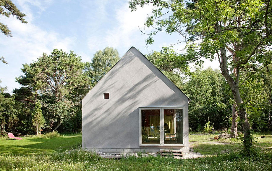 Constructed in 2010, the 64-square-meter HAMRA is a summer house located on the island of Gotland, Sweden, designed by architecture studio DinellJohansson. The project was developed on a limited budget, which was compensated by a long construction period involving friends and builders. The final design mimics the barn-like quality that the clients initially wanted to convert but could not find on the market. Following local building traditions, the exterior features plastered walls, built from lightweight concrete blocks, and a 45-degree gable roof clad in corrugated Aluzink steel sheets. The dimensions of the house and its openings were carefully planned to fit the size of the masonry blocks, minimizing material waste. Four large, 2.4x2m openings are arranged with rotational symmetry, one on each facade, giving the house a lack of hierarchy and treating all sides equally. Three of these are glazed doors, and one is a fixed window. The interior of HAMRA is one open space dominated by two plywood volumes that create areas for sleeping and play. All service functions, including technical equipment, water, and drainage, are organized along a narrow, 90cm-wide strip that runs through the house. Spatial elements like a kitchen, fireplace, stairs, storage, and bookshelves are also located along this strip. The furniture was largely assembled from salvaged or reused building materials. A corrugated steel ceiling and plastered walls give the interior an "outside but inside" quality, complemented by plywood-clad sections around two skylights. The kitchen features a 3.1x0.9-meter concrete bench with an integrated fireplace, cast in-situ, with cupboards made from remaining formwork plywood. Credits Architects: DinellJohansson (Morten Johansson) Location: Gotland, Sweden Year: 2010 Photographs: Elisabeth Toll