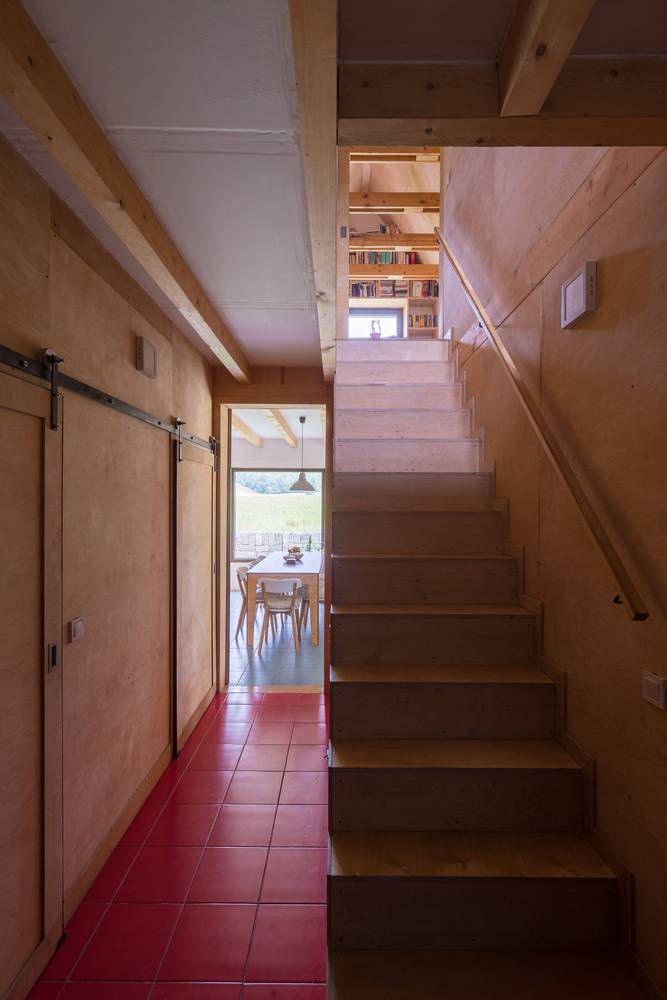 "House for Parents in Jeseniky is a family residence designed by TRI.ŠTRNÁST architekti and completed around 2021 in the Czech Republic. Situated near the Jeseníky Mountains, the project involved transforming a plot where a barn once stood. Instead of demolishing the original structure entirely, the architects salvaged the monumental granite walls, inserting a new timber construction between them to preserve the site's history. The new house is connected to a separate studio/garage via a central, multifunctional outdoor terrace. The design was created for an elderly couple who wished to move from a city apartment to a house with a garden. The primary living space is on the ground floor and is designed to accommodate the couple's future needs, featuring a no-threshold layout and a bathroom accessible to wheelchairs. This main floor includes an entry foyer, bathroom, utility room, living room with dining area and kitchen, and a bedroom. A staircase leads to an attic that serves as a bedroom for visiting family and provides storage for sports equipment for the nearby Ramzová ski area. The house emphasizes sustainability and low-energy performance. The KVH (solid constructional wood) lumber beam system was assembled with minimal fasteners and insulated with blown cellulose. For durability and aesthetic continuity with local architecture, the exterior is clad in charred spruce wood, an application of the shou sugi ban technique. The interior features perimeter walls lined with unfired bricks and finished with clay plaster, which helps regulate humidity and creates a comfortable indoor climate. Heating is provided by a solid fuel stove, with electric cables as a backup. The southern facade is complemented by a stone terrace shaded by a textile canopy, preventing the building from overheating. Credits Architects: TRI.ŠTRNÁST architekti Photography: Lukáš Ildža "