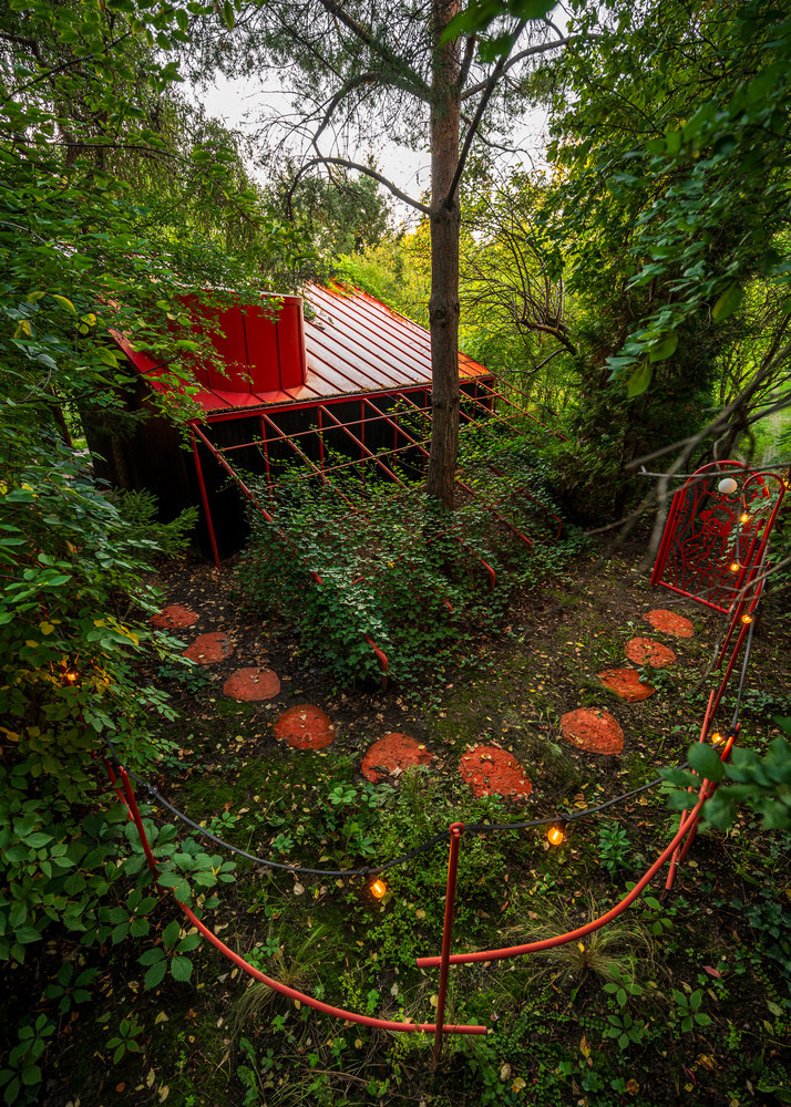 "Nestled in a family allotment garden in Warsaw, Poland, the House of Color Downtown Oasis is a vibrant, 35-square-meter tiny house designed by NOKE Architects. Inspired by the colorful personalities of its owners, singer and artist Magda Grabowska-Wacławek and her husband, animator Grzegorz Wacławek, the retreat serves as a tranquil escape from city life. Its electric red color palette and maximalist design aesthetic boldly translate the owners' creative spirit into architectural form. The location, a triangular-shaped plot, presented a key constraint: the regulations for allotment gardens mandate that permanent structures cannot exceed 35 square meters. NOKE Architects used this limitation to their advantage, designing a compact cottage that maximizes both form and function. The house is intentionally hidden from the street and only gradually reveals itself as one moves through the lush, free-growing greenery of the garden. This sense of discovery begins with a winding path of red stones, complemented by a glowing art installation, that leads visitors from the street. Inside, the compact space integrates a living area, kitchen, workspace, sleeping nook, and bathroom. The vibrant color scheme extends indoors, with plywood walls and ceilings stained with natural, eco-friendly oils. The interior palette balances the expressive colors with more muted wood tones and gray flooring. Large-format glazing visually dissolves the barrier between the interior and the garden, and can be opened to extend the living space onto the terrace. A quirky, semicircular window adds an artistic touch and offers a unique vantage point of the garden. A concealed entrance and a red, chimney-like volume housing the bathroom add an element of playful secrecy to the design. The bathroom itself is a surprising sensory experience, with cobalt tiles, mirror panels, and a glass roof that allows for stargazing while bathing. Project credits Architecture: NOKE Architects Design Team: Karol Pasternak, Piotr Maciaszek, Mateusz Jaworski Photography: Piotr Maciaszek Set Design: Ania Witko Client: Magda Grabowska-Wacławek and Grzegorz Wacławek"