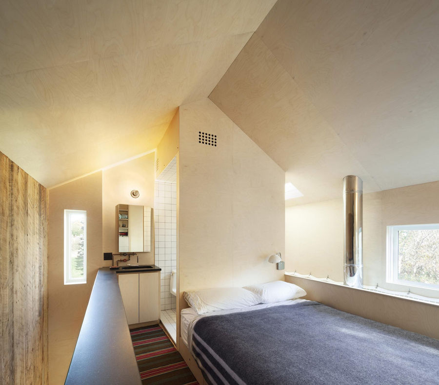 The Micro Cabin 323SF is a tiny guest house designed and completed in 2014 by Brooklyn-based Breitner Ciaccia—Office of Architecture (BC—OA). Located in Montauk, New York, the cabin is situated on a compact 12' x 15' footprint on an existing foundation next to a main house. Despite its extremely small size, the cabin was designed to function like a full-sized home, showcasing clever space management and high-performance design. The central idea behind the Micro Cabin was to treat its small floor plan as a "jewel box," with every millimeter carefully considered for maximum functionality. The architects, Amy Breitner and Greg Ciaccia, utilized multi-functional surfaces and thoughtful interventions to make the space feel both efficient and expansive. A recessed floor in the living area allows for a generous, built-in lounge, creating a distinct zone for relaxation without visually dividing the room. The flue of a small wood-burning fireplace extends from floor to ceiling, drawing the eye upward and emphasizing the double-height space above the entry. A skylight further amplifies this effect, inviting natural light into the core of the cabin. The kitchen and storage areas are cleverly tucked beneath the staircase, making efficient use of every cubic foot. The exterior and interior are defined by a contrast of materials. The north and west facades are clad in solid, reclaimed hickory wood, providing privacy from the nearby main house. The east and south facades feature strategically placed windows that connect the interior with the surrounding national forest land. The cabin is purposefully integrated with its natural surroundings. The careful placement of windows provides framed views of the tranquility of the adjacent forest. The exterior cladding, which will weather over time, helps the cabin blend into its rustic setting. Project credits Architects: BC—OA (Breitner Ciaccia—Office of Architecture) Photographer: Amy Barkow Location: Montauk, New York Completion Year: 2014