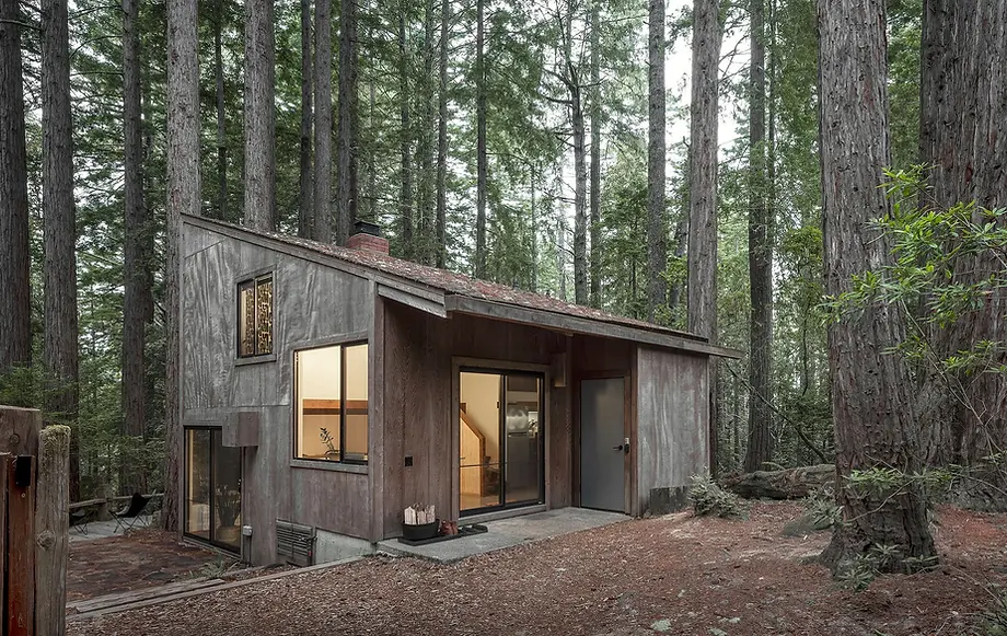 Designed by noted Bay Area architect Joseph Esherick, the home was third in a series of affordable demonstration houses commissioned by the developers of The Sea Ranch, a weekend home community and cultural experiment grounded in 1960s idealism. The home’s current owner, its second since its construction in 1968, sought to restore the home while improving its liveability and performance. George Homsey, Esherick’s partner, consulted on the exterior restoration. New plywood and laminate kitchen cabinets with apartment-size appliances were designed to utilize every inch of space. The original plywood shelving was restored using reclaimed materials from the demolition. A hinged partition gives privacy between the two bedrooms, designed to preserve the original intent of the bedroom level by folding away into the wall when not in use. Large windows connect the interior space to the coastal redwood forest, a towering specimen just outside the workspace window.