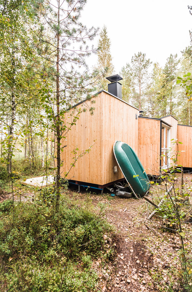 "Constructed by architecture and urban design students Timm Bergmann and Jonas Becker, who would later go on to found Studio Politaire, the ""Small but Fine"" Off-grid Cabin was completed in 2018 in a remote forest in Finland. The 280-square-foot structure was built on a modest budget of approximately $14,000, with the designers doing most of the work themselves. The off-grid cabin was designed as a simple and functional retreat to live in and reflect on self-reliance. Built on a rocky plot with a natural flat spot near a lake, the cabin’s design features four slightly offset rooms spread across a total floor space of 26.8 square meters, offering a different view of the surrounding landscape from each staggered window. The cabin's off-grid utilities include a water pump, a three-phase sewage system, and a hot water supply powered by solar energy and a wood-burning stove. To accommodate the cabin's location on swampy soil with no vehicular access, the designers first built a 650-foot-long elevated pathway to the nearest road. The foundation was built using concrete-filled steel pipes anchored into bedrock to ensure durability. The minimalist interior features wood-paneled walls and flooring, with plywood boards lining the ceilings. A wood-burning stove provides heat, while large windows allow natural light to flood the space and connect the occupants with nature. A small deck outside provides an open-air area for a tranquil retreat. Credits Architects: Timm Bergmann and Jonas Becker (Studio Politaire) Photography: André Boettcher, Studio Politaire"