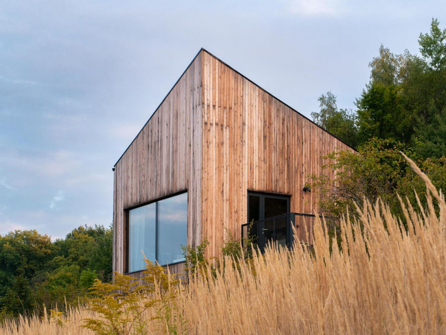 "The Small Vacation Cottages u Gai are a pair of small summer houses located on a steep hillside in Radomice, Poland, with panoramic views of the Karkonosze Mountains. Designed by Polish firm SAN Architektura, the project was inspired by a nearby closed quarry and a desire to reflect the natural landscape. The cottages are designed to look like freely scattered, hewn boulders on the slope, with plans for a third, larger building—a single-family home for the owners—to be added in the future. The design of the 81-square-meter cottages is both simple and strategic. Built on square plans, they feature a ground-floor living area with a kitchenette, a bathroom, and a dressing room. A mezzanine bedroom on a diagonal to the main floor is aligned with the roofline to create a sense of height and maximize usable space. The interiors emphasize the views, with large, 4.5-meter-wide panoramic windows framing the mountain landscape. The construction and materials were chosen to harmonize with the wild surroundings. The structures were built using the HBE glued timber system, eliminating the need for additional interior wall finishes. The exterior is clad in Siberian larch, which was left untreated to allow it to patinate naturally under the sun's UV rays, helping the cottages blend into the landscape. The base of each cottage is finished with hewn stone, referencing the nearby quarry and grounding the structures to the site. The cottages are slightly elevated from their stone plinths, creating the impression that they are levitating over the slope. This design choice not only enhances the visual effect but also brings occupants closer to the surrounding nature, as bushes seen from the living room resemble treetops. To preserve the natural, wild character of the plot, the architects opted for unpaved paths using aggregate from the local area and avoided adding fences. Credits Architect: SAN Architektura Lead Architect: Rafał Oleksik Photography: Michał Drapała Construction: AM Projekty Konstrukcje HVAC Engineers: Michał Baran Embe Studio Electrical Engineer: Paweł Kóska Manufacturers: Dombal, Konsbud, Novobudowa"
