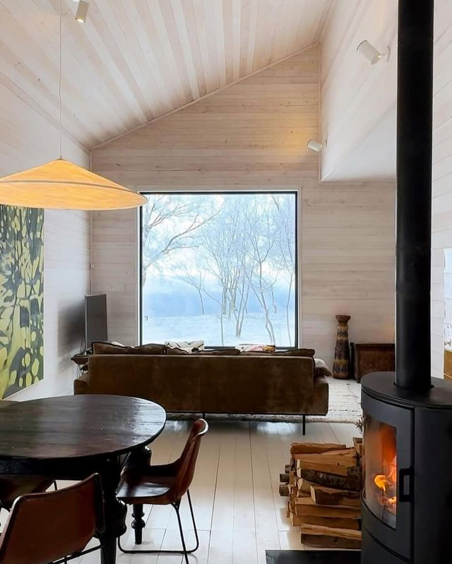 Designed by Belgian art dealer and designer Kris Ghesquière, The Mountain Cabin is a secluded retreat located in the Betania mountains, a 45-minute drive from Tbilisi, Georgia. Originally conceived as a weekend getaway, the project evolved into a more permanent refuge for the designer. Nestled in a location with no electricity, phone reception, or neighbors, the cabin is a testament to mindful, solitary living. The small, one-room structure is built with a lightweight, timber-frame construction. A unique feature of the design is the use of sliding floor-to-ceiling glass doors on one side, which not only provide expansive views of the wooded surroundings but also fully open to connect the interior with the natural landscape. When fully open, the cabin essentially becomes a semi-enclosed terrace, blurring the line between inside and out. Inside, the space features a polished concrete floor and a central steel-plate fireplace that creates a focal point. A black, custom-built kitchen is integrated into the wall opposite the fireplace, while a bathtub is strategically placed in front of the large windows to maximize the view. The ceiling is finished with pine plywood panels, while a skylight over the bed bathes the room in natural light. The project was built over five months with the help of a small team of local carpenters. Materials were sourced locally, with the primary construction using timber and stone from the area, a choice that grounded the building in its natural surroundings. The home's design reflects a philosophy of prioritizing a connection to nature over modern conveniences, offering a quiet escape from the distractions of city life. Credits Designer: Kris Ghesquière Photography: Interieri Magazine, Kris Ghesquière