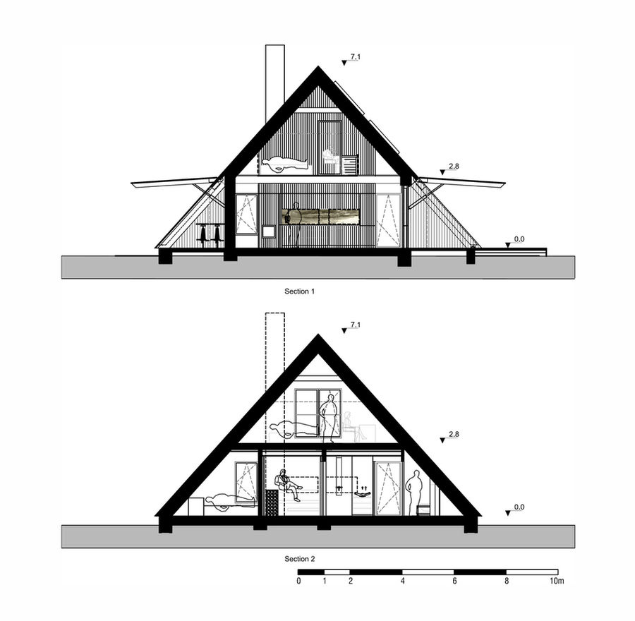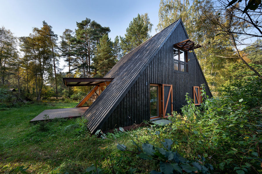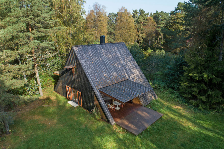 The Kuku-Ranna Summer House, designed by Arhitektuuribüroo Eek & Mutso, is an award-winning residential project in the village of Vääna-Jõesuu, Estonia. Located approximately 35 km from Tallinn and 150 meters from the sea, the house features a minimalist A-frame structure with kinetic elements that open it to its natural surroundings during the summer months. Completed in 2020, the project was commissioned as a seasonal retreat, which influenced its unique "closed" and "open" personalities. The house is designed to blend seamlessly into the forest landscape, resembling a tepee or a traditional farmhouse, but with a modern twist. When not in use, it is a discreet, unnoticeable structure with its striking black exterior made of yakisugi—burnt wood—cladding. When the residents arrive, the house transforms dramatically: Kinetic shutters: Large shutters on the main facade rise like wings to reveal a large glass wall, while a rear shutter opens to a small workshop. The dark, protective exterior contrasts with the light, minimalist interior, which is visible once the house is open. The A-frame structure cleverly maximizes its 80 square meters of net area. The interior features a ground-floor living space that extends onto a terrace, a compact sauna and bedroom tucked into the lower eaves, and a master suite on the upper level. The light-colored interior features a blend of modern furniture and repurposed vintage items, such as an oval window salvaged from a Tallinn Art Nouveau villa. A double bass is also repurposed as a shelf. Gaps in the floorboards upstairs allow warm air to rise and light to filter through, contributing to the feeling of airiness. The house rests on a concrete slab and features a timber frame. Steel elements were used to ensure the rigidity of the moving shutters. Awards and recognition 2021 Estonian Architecture Awards (ERAMU prize): Winner for a private house. 2021 Estonian Association of Interior Architects: Nominee for the annual award. Credits Architects: Arhitektuuribüroo Eek & Mutso Lead Architect: Madis Eek Landscape Design: Margit Mutso Engineering: Toomas Tammerik Photography: Toomas Tuul Manufacturers: Balti Plaadikaubandus, Emotionwalls, Hansacom, Pinska, Prokliima, Raidkivi, Silman